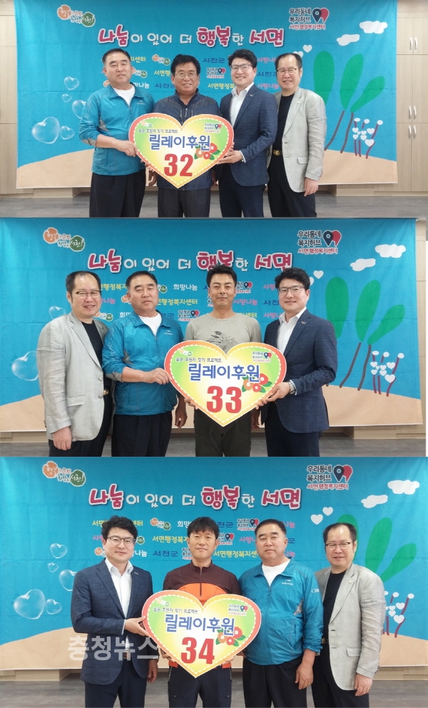 제13회 서천 자연산 광어·도미축제에 참가한 이동상인회 정찬금 팀장 등 3명이 서면 릴레이 후원에 참여하기 위해 지난 1일 서면행정복지센터를 방문했다.