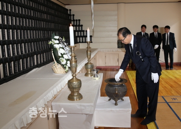제62회 현충일 추념식에서 이석화 청양군수가 분향하고 있다.