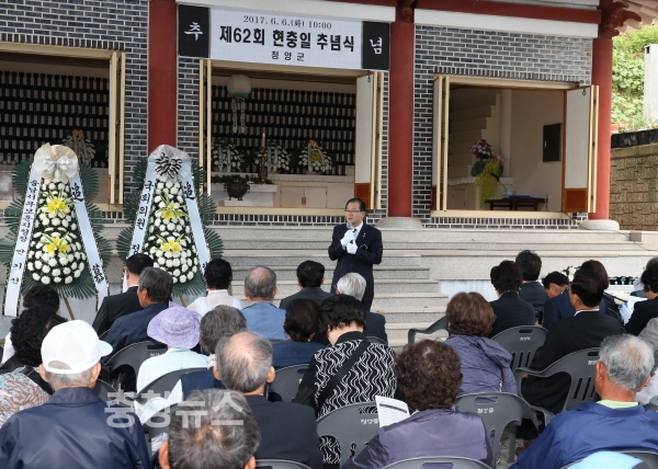 충남 청양군이 지난 6일 청양읍 우산 충령사에서 순국선열과 호국영령들의 숭고한 희생정신을 기리고 유가족의 명예를 높이기 위한 제62회 현충일 추념식을 거행했다.