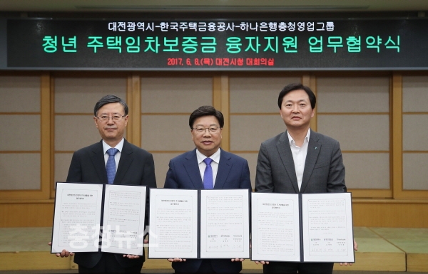 대전시(시장 권선택)는 8일 오전 11시 40분 시청 대회의실에서 권선택 시장과 김재천 한국주택금융공사 사장, 민인홍 하나은행 충청영업그룹 대표가 참석한 가운데 ‘청년주택임차보증금 융자지원 업무협약’을 체결했다.