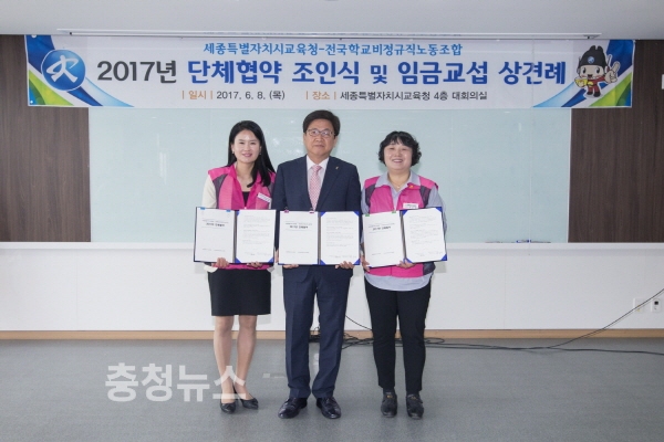세종시교육청(교육감 최교진청)은 8일 교육청 4층 대회의실에서 전국학교비정규직노동조합(위원장 박금자)과 2017년 단체협약을 체결했다.