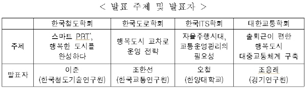 다음으로는 각 학회별 대표자들이 ‘행복도시의 미래 교통정책 방향’을 제안하는 주제발표 시간을 가졌다.