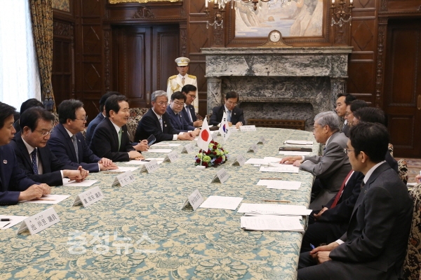 정 의장은 이어 “한일 양국간 어려운 문제 있을 때에 의회대화채널이 가동되어 왔고, 지금이 더욱 필요한 시점”이라고 전한 뒤 “재일동포들의 안전한 생업환경 조성을 위한 ‘헤이트스피치 대책법’ 과 ‘한일어업협상’의 조속한 타결 등에 대해서도 일본 의회의 적극적인 지원을 당부한다”고 말했다.