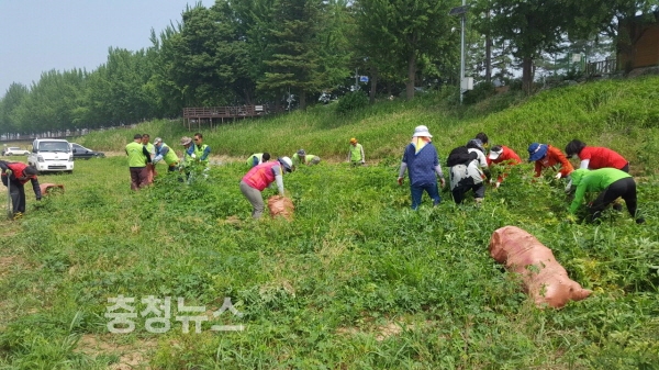 충남 아산시(시장 복기왕)는 지난 8일 곡교천에서 야생생물관리협회 충남지회(회장 정인승)회원 10명과 아산지회(회장 최학선) 회원 40명이 참여해 생태계보전을 위한 생태계교란식물(단풍잎 돼지풀, 가시박) 제거 활동을 대대적으로 실시했다고 밝혔다.