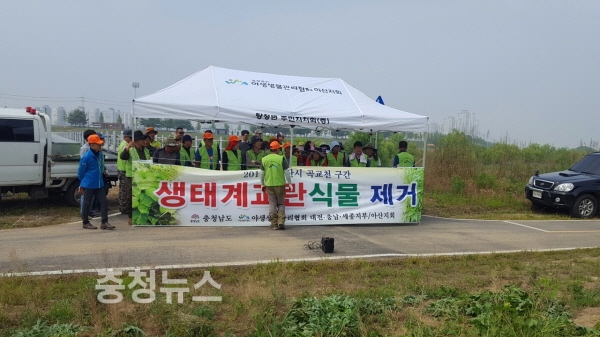 야생생물관리협회 충남지회와 아산지회 회원 50명 참여 교란식물 제거활동