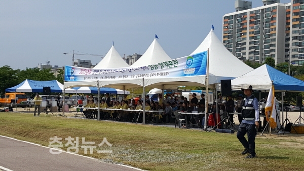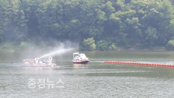 이날 합동훈련은 공주시와 환경부, 금강유역환경청, 한국환경공단, 한국수자원공사, 주민 등 120여명이 참여한 가운데 금강에 유조차 전복 및 탱크파손으로 인한 유류 유입 사고 상황을 가정하고 상황전파, 초동조치 및 인명구조, 방제선 구축 등의 순으로 진행됐다.