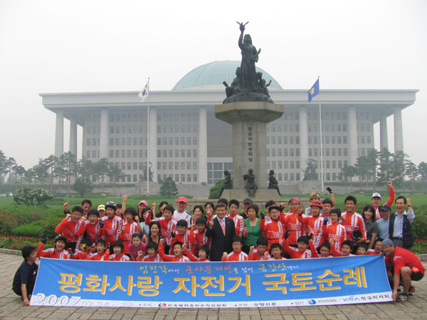 민족평화축전 조직위원회(위원장 김원웅)에서 주관하는 "제3회 평화사랑 청소년 자전거 국토순례" 발대식이 7월 24일(화) 10시, 국회의사당 분수대 앞에서 진행했다.