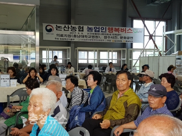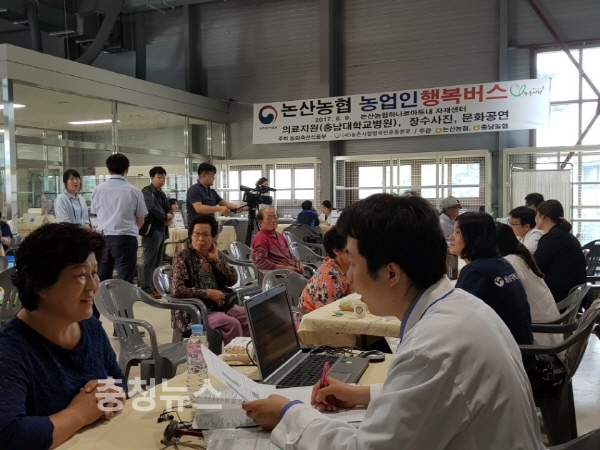 농협 충남지역본부(본부장 유찬형)는 9일 논산농협(조합장 강영배)에서 농업인들을 대상으로 찾아가는 농촌복지사업 ‘농업인 행복버스'출발을 알렸다.