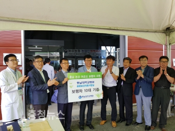 이날, 실시한 농업인 무료진료에는 충남대학교병원 의료봉사단 40여명이 참여하여 내과, 정형외과, 마취통증의학과, 가정의학과, 이비인후과 등 진료하였으며, X-ray 촬영장비 갖춘 버스와 각종 검사로 고령농업인 및 취약가정 300여명 무료진료를 실시하였으며, 거동이 불편한 어르신들 10명에게 충남대학교병원 의료봉사단이 준비한 보조카를 지원하였다.