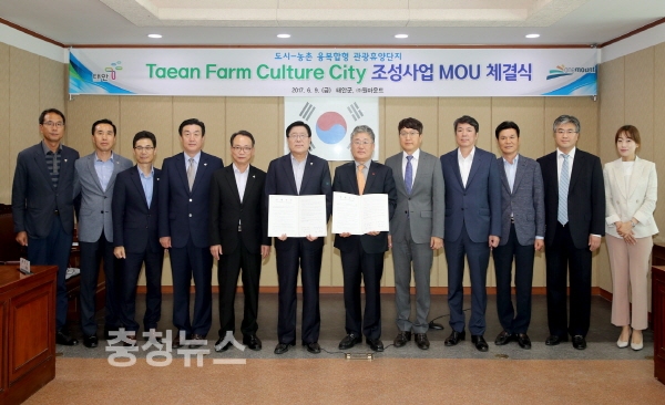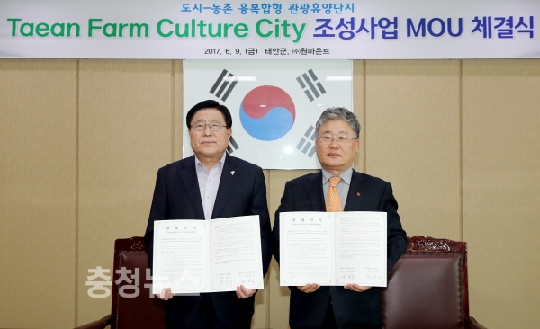 충남 태안군은 9일 군청 소회의실에서 한상기 군수와 배병복 ㈜원마운트 회장 등 10여 명이 참석한 가운데 ‘태안 팜컬처시티 조성 사업’ 관련 양해각서(MOU)를 체결하고 구체적 개발계획을 수립해 충남도에 사업계획을 제안하기로 했다고 밝혔다.
