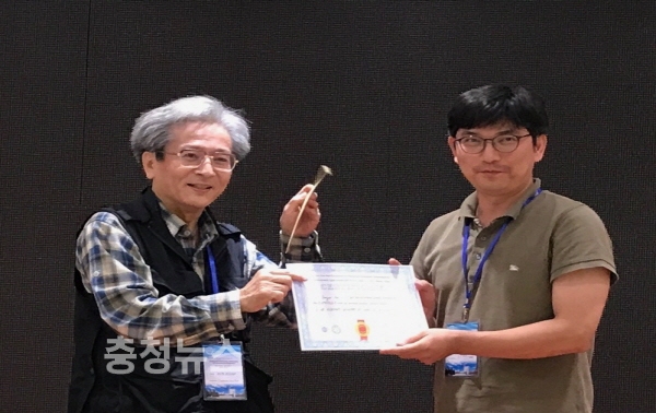 한국기계연구원 한방우 책임연구원(사진 오른쪽)이 11일 중국 대련 대련이공대에서 개최된 ‘한중일 플라즈마/정전기 기술 교류회’에서 베스터 포스터 상을 수상하고 있다.