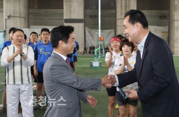 청룡족구장에서 열린 ‘인조잔디 준공기념 초청교류전’ 개회식에서, 윤승현 회장은 이날 감사패를 전달하며 “노희준 의원이 발 벗고 나서 귀한 예산을 확보해 주셔서, 청룡족구장 기능 보강 사업 준공될 수 있었다”며 고마움을 표시했다.