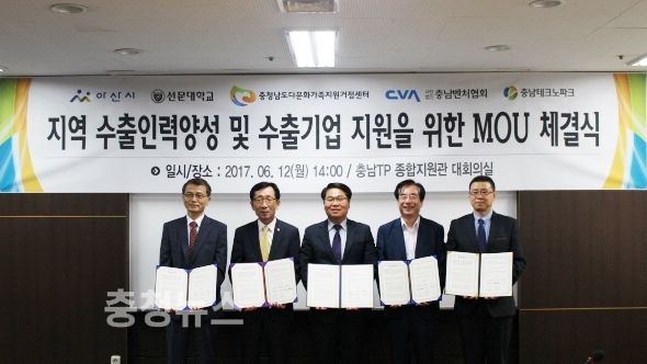 시는 지난 12일 충남테크노파크에서 충남벤처협회 주관으로 열린 협약식에서 아산시 부시장, 충남테크노파크원장, 선문대학교 부총장, 충남다문화가족지원거점센터장, 충남벤처협회장이 참석한 가운데 지역 외국인 이주민 및 청년인재를 수출인력으로 양성하는 것을 골자로 하는 협약을 체결했다.