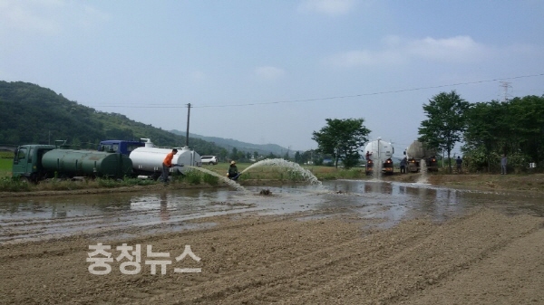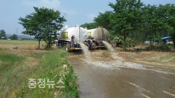 또한 군은 14일 물 고갈이 심한 삽교읍, 대술면, 광시면, 대흥면 지역 약 2만 7440㎡에 대한한돈협회 예산군지부(지부장 이강영)의 액비수송 차량 20여대(6t 8대, 9t 8대, 20t 6대 등)를 지원받아 용수를 공급하는 등 농민들의 마음에 단비를 뿌려줬다.