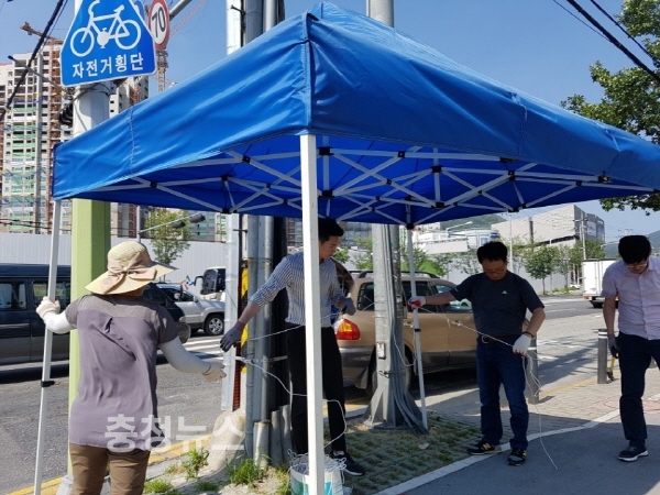 대전 동구 판암1동주민센터(동장 윤재경)는 횡단보도 신호를 기다리는 보행자들에게 편의를 제공하기 위해 판암역네거리와 판암초교 입구 삼거리에 총 5곳의 그늘막쉼터를 조성했다고 14일 밝혔다.