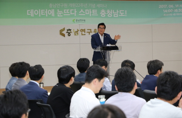 윤석우 충남도의회 의장은 15일 충남연구원 개원 22주년 기념 세미나에 참석해 4차산업 혁명시대를 대비한 선도적인 연구 시스템 도입을 주문했다.