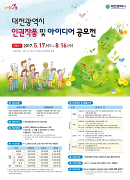 이번 공모전은 인권과 관련된 캐릭터, UCC, 포스터 등 인권작품 부문과 대전에 인권존중 문화 확산을 위한 인권정책 아이디어 부문에 응모할 수 있으며 응모자격은 지역, 연령 제한없이 전국민 누구나 참여 가능하다.