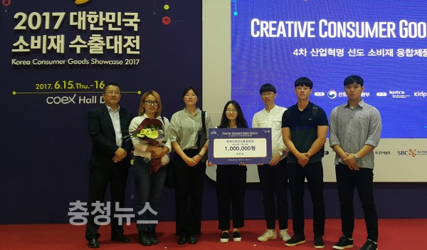 건양대학교(총장 김희수) PRIME창의융합대학 학생들이 지난 15일 삼성동 코엑스에서 열린 제1회 4차 산업혁명 선도 소비재 융합제품 경진대회 시상식에서 아이디어 기획부문 한국디자인진흥원장상을 수상했다.