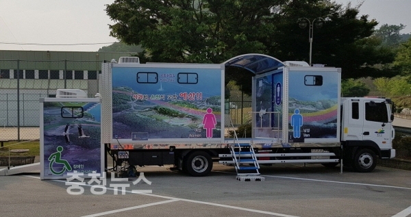 19일 군에 따르면 차량형 이동식 공중화장실은 그동안 군이 각종 행사 시 공중화장실을 임대해 사용했지만 상수도 및 전기 시설이 없는 경우 여성 및 장애인 등이 큰 불편을 겪어 왔기 때문에 이러한 불편을 줄이고 이용자들에게 편의를 제공하고자 마련됐다.