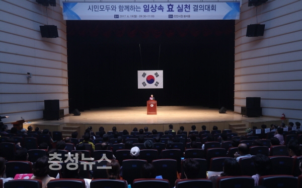 충남 천안시는 19일 시청 봉서홀에서 민간단체 등 400명이 참석한 가운데 일상속 효 실천 결의대회를 개최했다.
