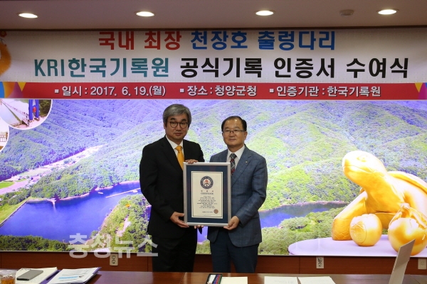 청양군은 정산면 천장호 수면에 설치한 출렁다리가 우리나라에서 가장 긴 다리로 공증 받아 19일 군청 상황실에서 이석화 군수와 김덕은 한국기록원장 등 관계자 20여명이 참석한 가운데 인증서 수여식을 가졌다.