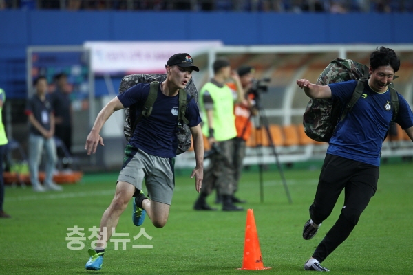 하프타임에는 특별 이벤트로 32사단 현역장병 10명과 사전신청을 통해 접수받은 예비역 10명의 ‘군장 메고 이어달리기’ 시합이 열렸다. 현역장병들의 패기와 예비역들의 노련함을 겨루는 이색적인 번외경기는 참가자와 관중들에게 큰 호응을 얻었다.