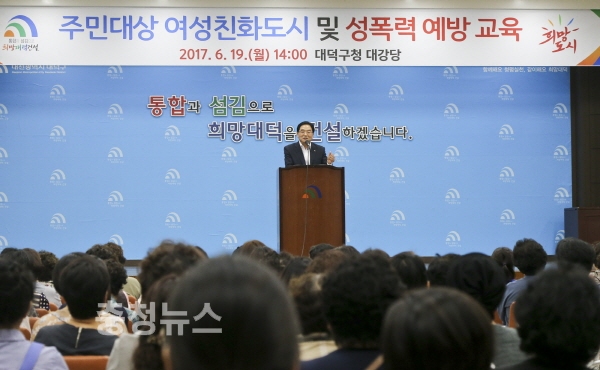 대전 대덕구(구청장 박수범)는 19일 구청 대강당에서 12개 동 리더와 주민 200여 명을 대상으로 ‘여성친화도시 이해 및 성폭력예방교육’을 실시했다.