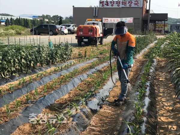 충남 아산시 탕정면(면장 서장원)은 지속되는 가뭄으로 피해를 호소하는 농민들을 위해 산불진화차량을 이용하여 밭작물에 물을 공급하고 있어 주민들로부터 호응을 얻고 있다.