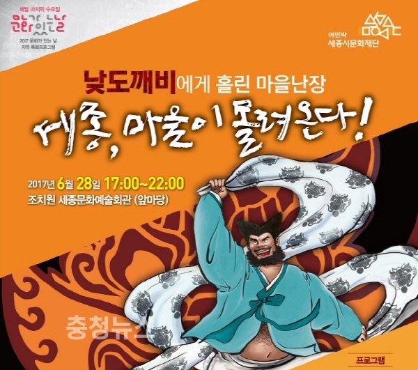 세종시문화재단(대표이사 인병택)은 오는 28일 조치원 세종시문화예술회관 앞마당에서 2017 문화가 있는 날 세종특화프로그램 낮도깨비에게 홀린 마을 난장 ‘세종, 마을이 몰려온다!’를 개최한다.
