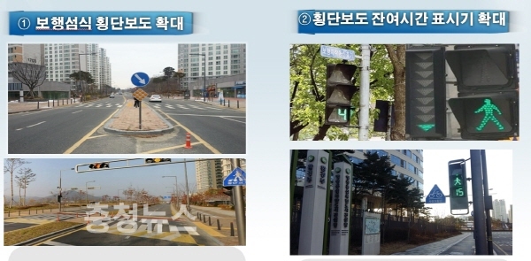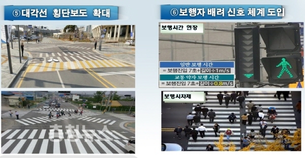 특히, "차도를 건너는 보행자의 안전․편의를 높이기 위해 보행섬, 횡단보도 잔여시간 표시기, 고원식․대각선 횡단보도 구축 등 보행자를 적극 배려하는 신호체계도 확대할 계획"이라고 밝혔다.