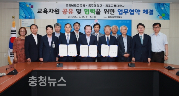 충남도교육청(교육감 김지철)은 21일 도교육청 제1회의실에서 공주대학교(총장 직무대리 김희수), 공주교육대학교(총장 안병근)와 상호 협력할 것을 합의하는 전략적 업무 협약(MOU)을 체결했다.