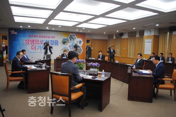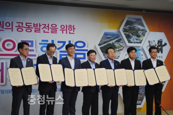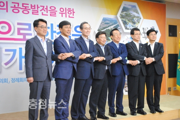 중부권 7개 시·도지사들이 21일 대전시청에서 "중부권은 대한민국의 허리"라며 "국토개발, 경제개발을 중부권 중심으로 이뤄내야 한다"고 목소리를 높였다.