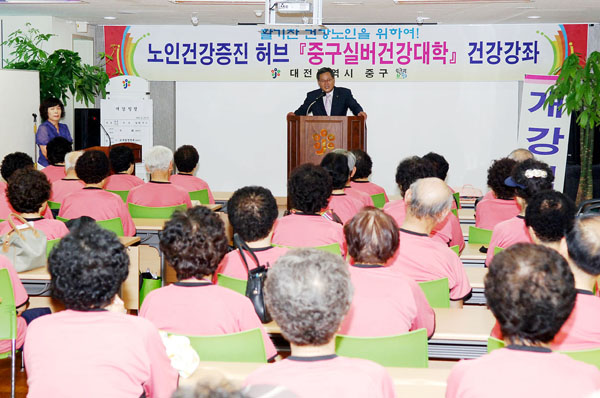 대전 중구(구청장 이은권)는 10일 중구보건지소에서 관내 65세 이상 노인 70여명을 대상으로 "중구실버 건강대학"운영을 이론교육(10회)과 실기교육(40회)을 매주 월,수,금요일에 3개월동안  실시한다.