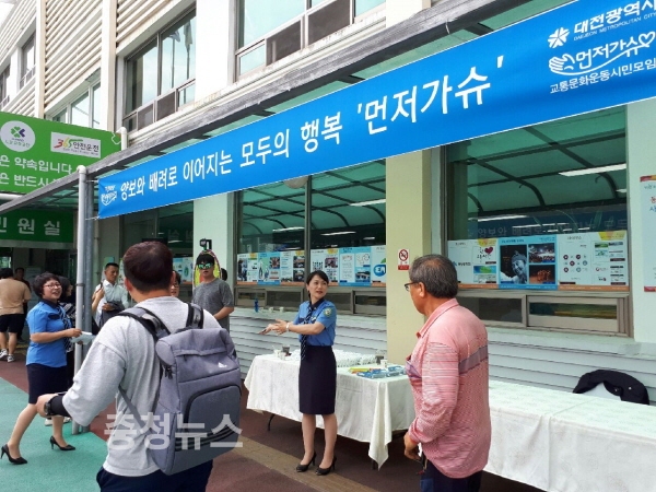 대전시(시장 권선택)는 23일 ‘교통문화의 날’을 맞아 대전운전면허시험장을 방문한 200여명의 시민을 대상으로 먼저가슈 홍보캠페인을 전개했다.