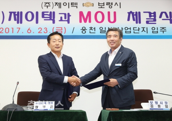 이날 MOU는 김동일 보령시장과 ㈜제이텍 장두훈 대표이사 등 관계자가 참석한 가운데 기업의 투자계획 설명, 협약서 서명 순으로 진행됐고, 시는 법령이 허용하는 범위 내에서 행정 지원을, ㈜제이텍은 투자계획 이행 및 투자규모 확충과 사회적 책임이행에 솔선, 고용창출 등 지역경제 활성화를 위해 노력할 것을 상호 협력키로 했다.