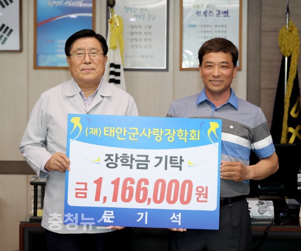 태안군 문기석 씨(제일쌀상회 운영, 前 태안특산물전통시장 상인회 회장)가 지난 22일 (재)태안군사랑장학회에 장학금 116만 6천원을 기탁했다.