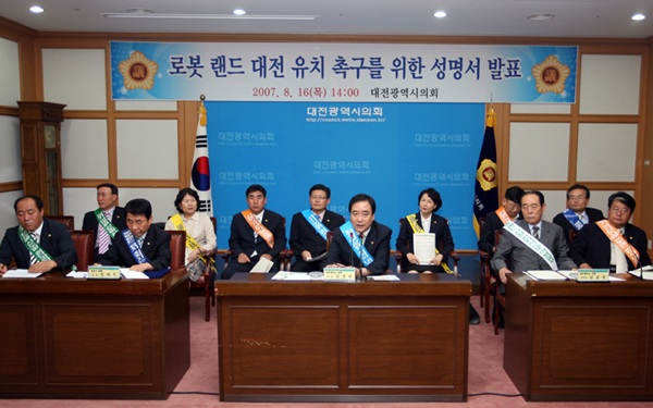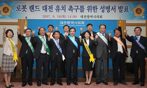 대전시▪구지방의원들은 기자회견을 갖고 "대한민국 로봇산업의 허브도시이자 휴보의 고향인 대전이 반드시 선정되기를 대전시의회 의원 및 자치구의회 의원등이 촉구하고 성명서를 발표했다.