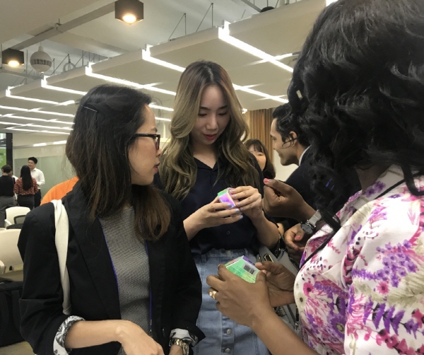 보육기업 SMTEK 김종수 대표에게 제품설명을 듣고 동료들에게 아이템 설명을 하고 있는 KDI참가자