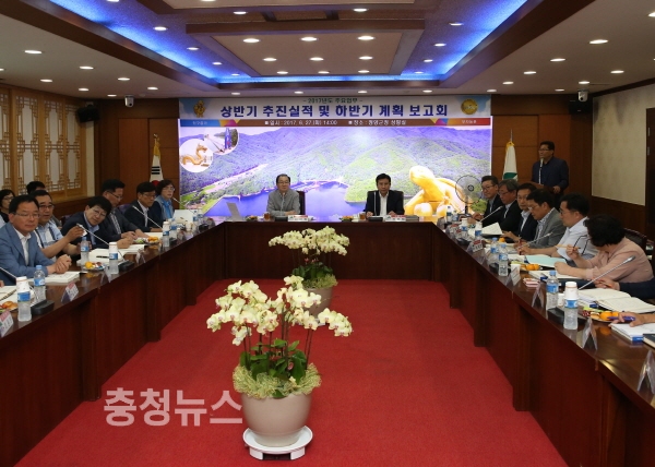 2017년 ‘넘버원 청양 행복한 군민 실현’을 목표로 쉼 없이 달려온 청양군이 27일 군청 상황실에서 상반기 주요업무 추진실적 및 하반기 계획 보고회를 개최했다.