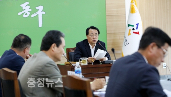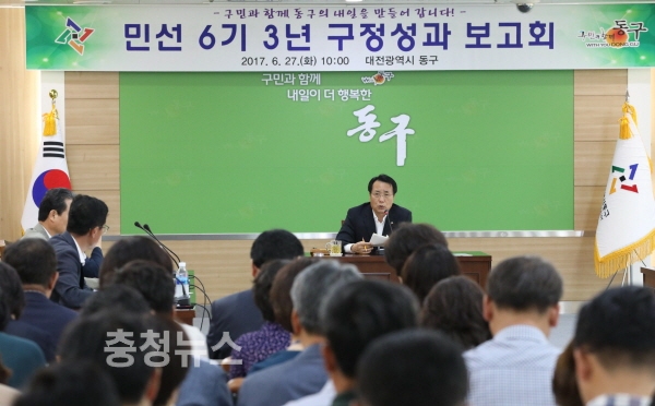 대전 동구는 27일 구청 중회의실에서 한현택 구청장을 비롯한 담당급 이상 공무원 100여 명이 참석한 가운데 민선6기 3년 구정성과 보고회를 열었다.