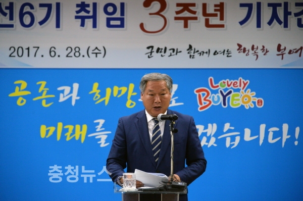 이용우 부여군수가 28일 오전 군청 브리핑실에서 기자회견을 열고, ‘새로운 변화, 진정한 변화’를 이루어낸 민선 6기 3년의 군정성과와 향후 비전을 발표했다.