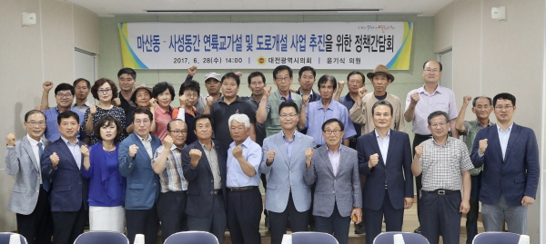 대전시의회 윤기식 의원(더불어민주당, 동구2)이 28일 동구 대청동 다목적회관에서 ‘마산동 – 사성동간 연륙교가설 및 도로개설 사업 추진을 위한 정책간담회’를 개최했다.