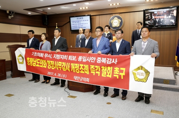 충남 태안군의회(의장 이용희)는 28일, 제245회 제1차 정례회 폐회에 앞서 충청남도의회 행정사무감사 조례 개정 철회 촉구 성명서를 채택했다.