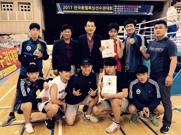 금메달을 획득한 조세형(오른쪽: 세번째 와 동메달 홍인기 선수(오른쪽 두번째)가 복싱부 선수들과 기념촬영을 하고 있다.