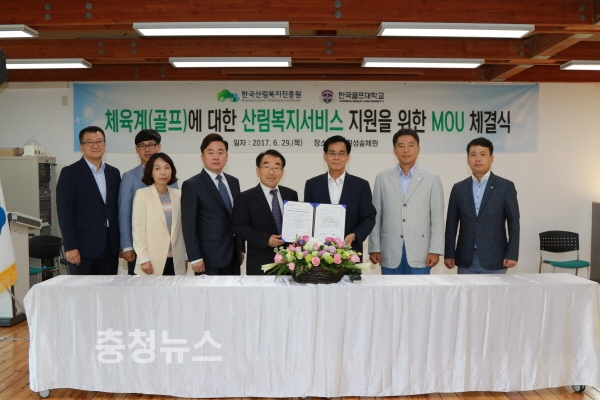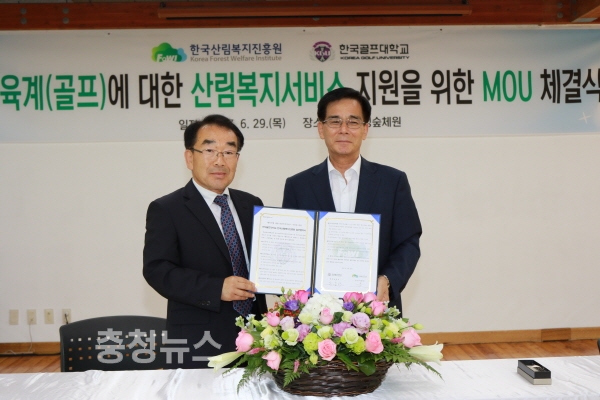 한국산림복지진흥원(이사장 윤영균)은 29일 국립횡성숲체원에서 한국골프대학교(총장 송충석)와 체육인(골프) 등에게 산림복지서비스를 제공하기 위한 업무협약을 체결했다고 밝혔다.