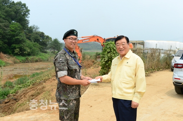 충남 김석환 홍성군수는 지난 29일 은하면 덕실리와 서부면 광리를 찾아 가뭄피해 관련 대민지원을 나온 32사단 공병대대를 방문해 격려하는 시간을 가졌다.