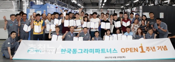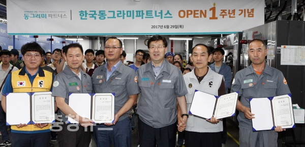 한국타이어(대표이사 서승화)가 지난 29일 한국타이어 대전공장에 위치한 자회사형 장애인 표준사업장인 ‘한국동그라미파트너스’의 오픈 1주년 기념 행사를 개최했다.