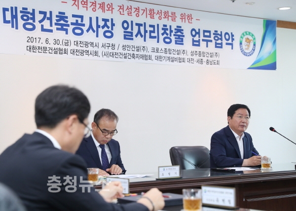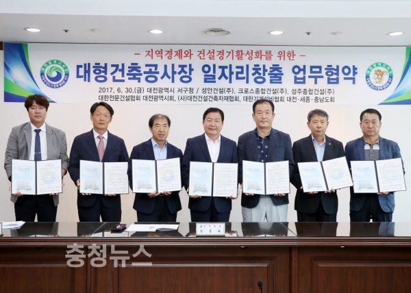 대전 서구(구청장 장종태)는 지난 30일 구청 다목적실에서 성안건설(주), 크로스종합건설(주), 성주종합건설(주), 대한전문건설협회 대전시지회, 사단법인 대전건설 건축자재협회, 대한기계설비건설협회 대전·세종·충남도회와 ‘대형건축공사장 일자리 창출’ 업무협약(MOU)을 체결했다고 밝혔다.