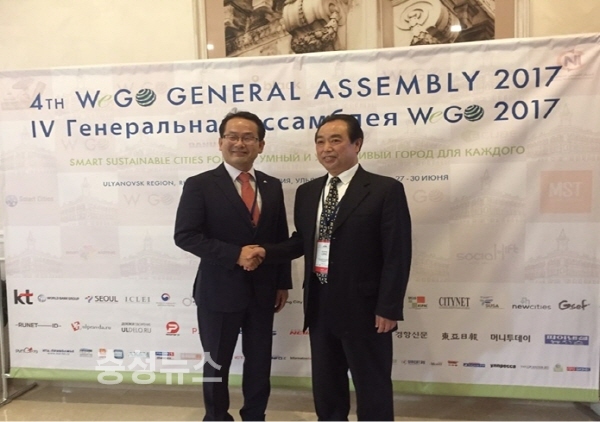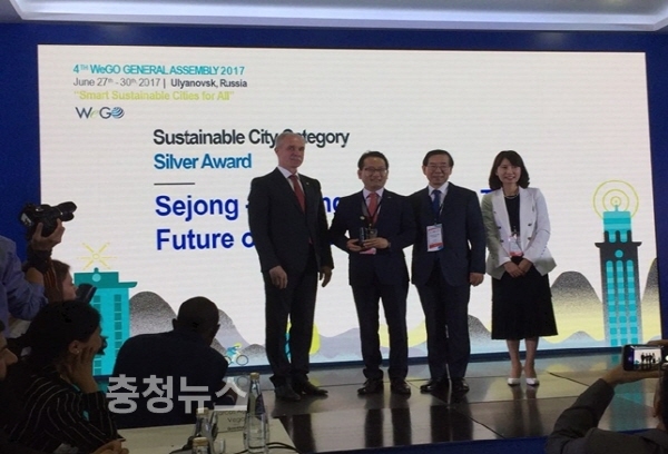 이춘희 세종시장을 대신해 27~30일까지 러시아 율리아노브스크에서 열린 WeGO(세계도시전자정부협의체) 총회에 참가한 강준현 정무부시장은 전 세계 56개 도시, 76개 프로젝트가 참가한 이번 총회에서 환경, 에너지, 안전 등에 관련한 도시 서비스 정책으로 수상의 영예를 안았다고 전했다.