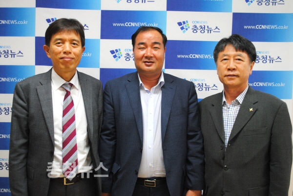 (왼쪽부터) 이강혁 동구 부구청장, 김거수 (주)충청뉴스 대표, 곽면섭 생활지원국장이 (주)충청뉴스 본사에서 기념촬영을 하고 있다.